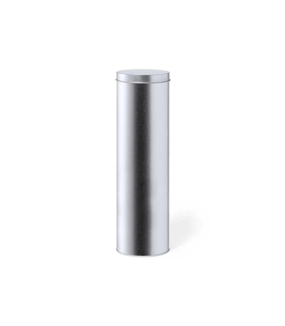 Caja de presentación formato cilíndrico, fabricada en resistente metal de acabado plateado y con tapa a juego.