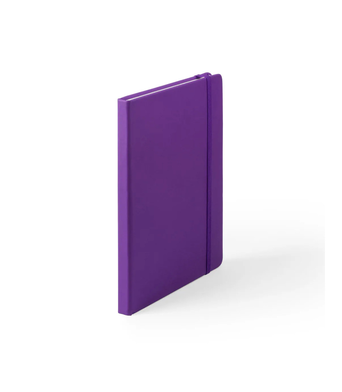 Bloc de notas con tapas de suave tacto, acabado en polipiel y en desenfadados colores. De 100 hojas lisas, con elástico de sujeción y marcapáginas de tela a juego.