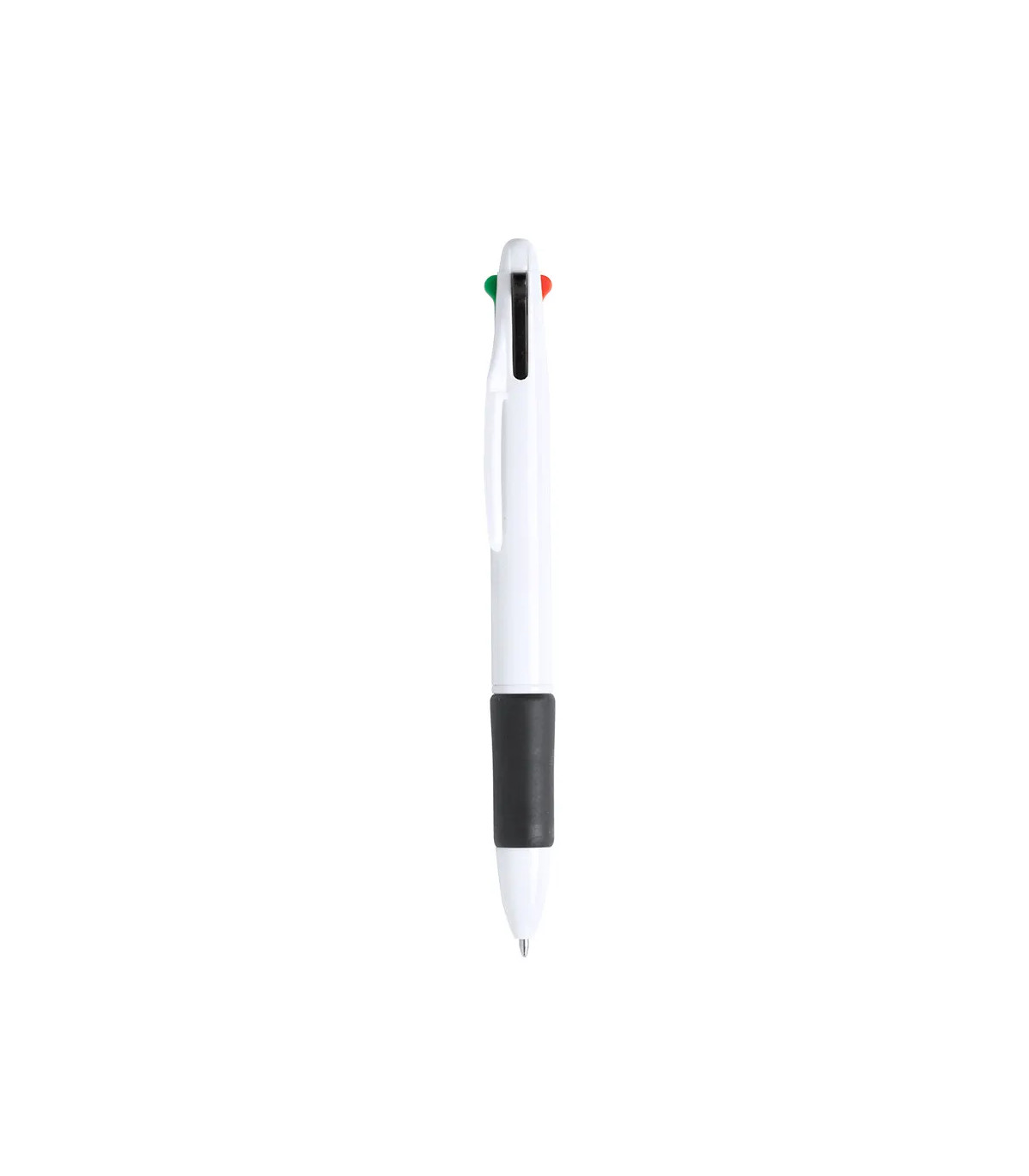 Bolígrafo 4 en 1 de mecanismo pulsador retráctil, de clásico diseño y cuerpo de suave acabado sólido en color blanco. Suave empuñadura a juego en vivos colores. De 4 cartuchos, en tintas azul, negra, roja y verde.