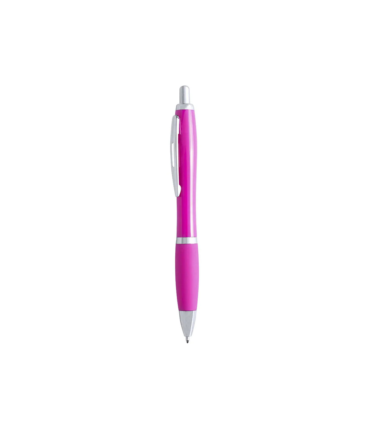 Bolígrafo de mecanismo pulsador de atrevido diseño bicolor con accesorios en color plateado y cuerpo de suave acabado en divertidos colores sólidos. Con original clip metálico troquelado a juego y cómoda empuñadura. Tinta azul.