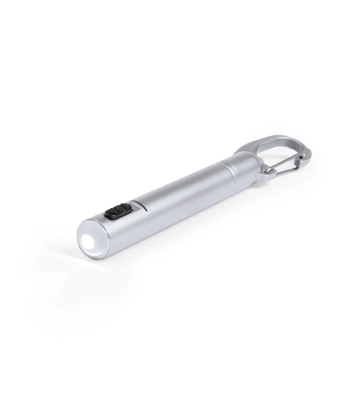 Boligrafo con linterna led integrada. De original diseño, con cuerpo en suave acabado metalizado de variados colores y capucha con mosquetón. En tinta azul y con pilas de botón incluidas.