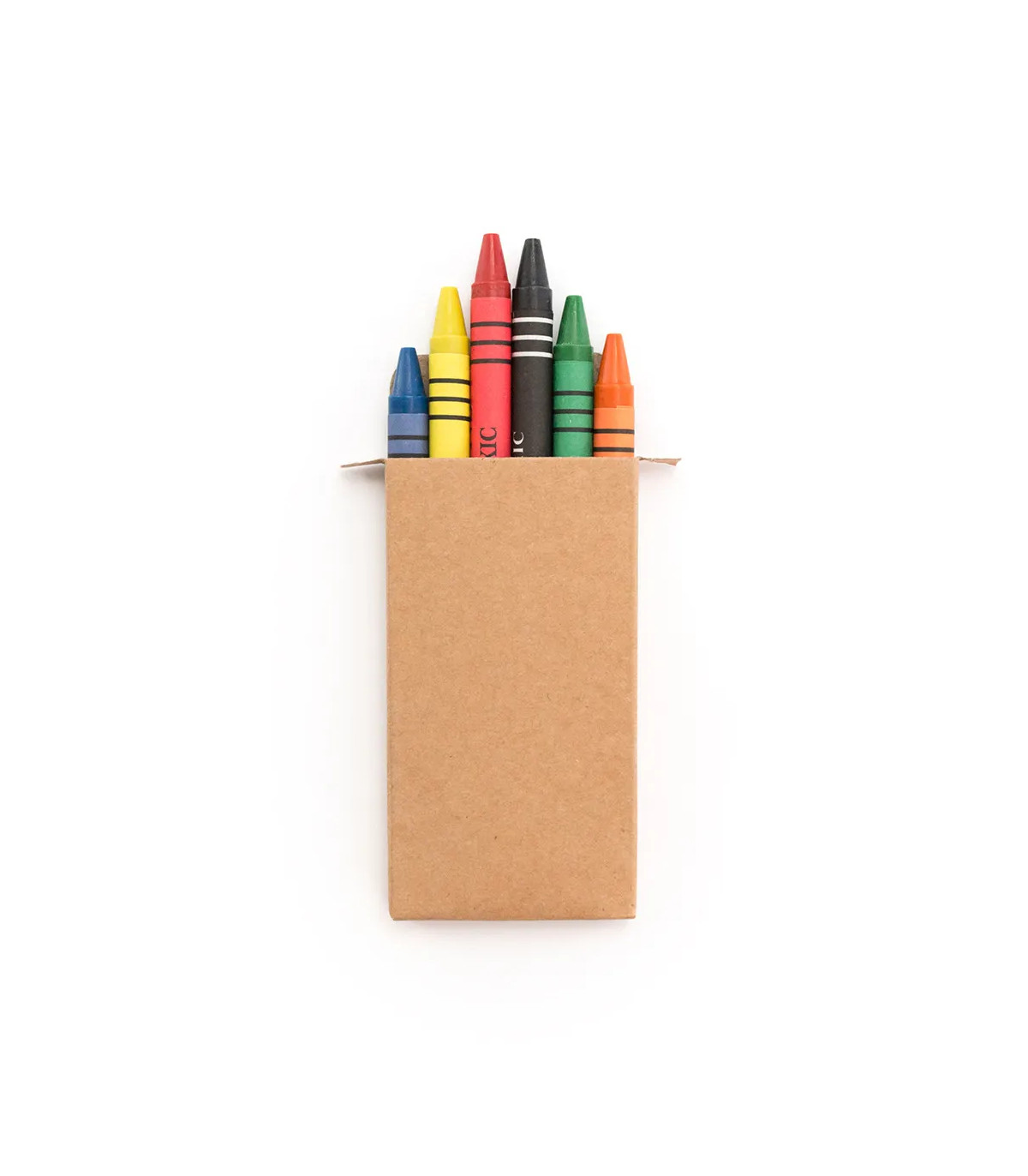 Set de 6 ceras en caja de cartón natural. Con cuerpo cilíndrico en variados colores. En colores rojo, verde, amarillo, azul, marrón, y naranja.