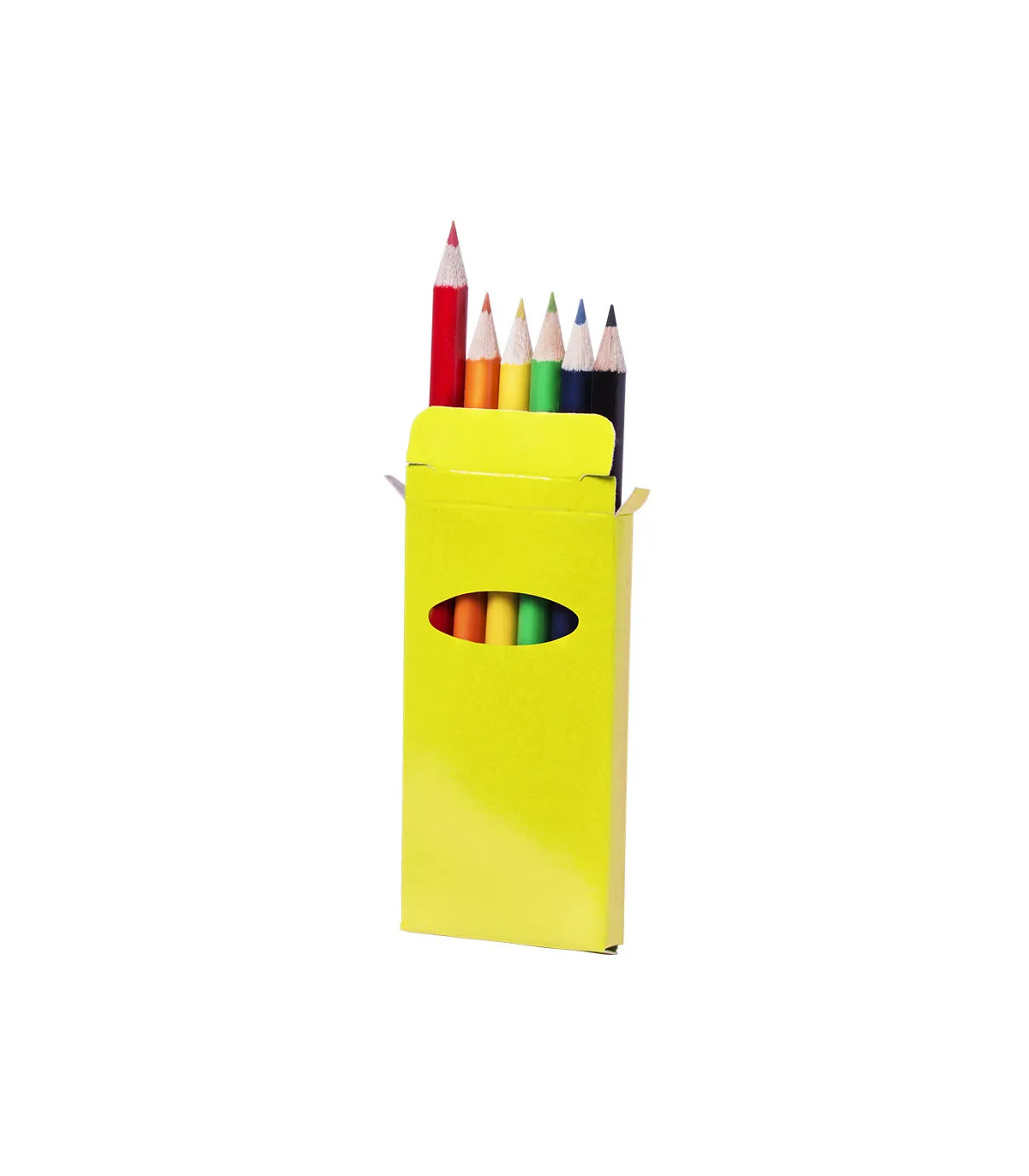 Set de 6 lápices en caja de cartón con acabado brillante en vivos colores y ventana. Lápices de madera con cuerpo cilíndrico en variados colores brillantes y minas en divertidos colores.