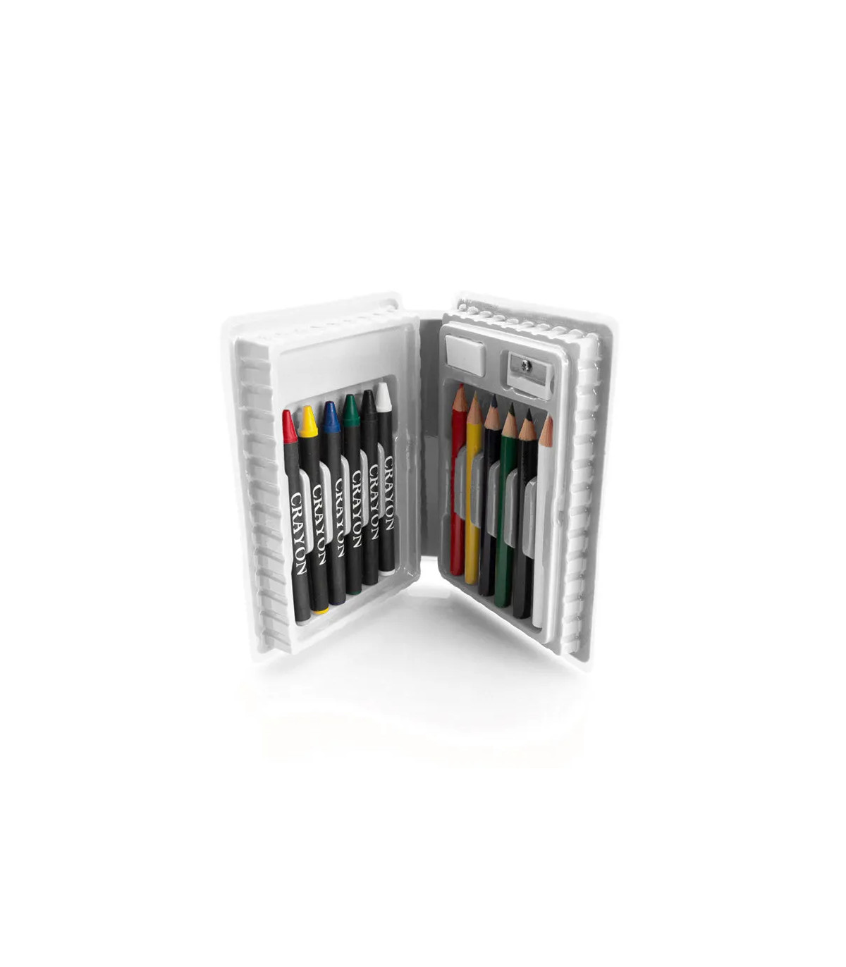 Set de 14 piezas en estuche con resistente cuerpo acabado en brillantes colores e interior con compartimentos de seguridad. Contiene goma, sacapuntas, ceras y lápices de madera de cuerpo cilíndrico en variados colores.
