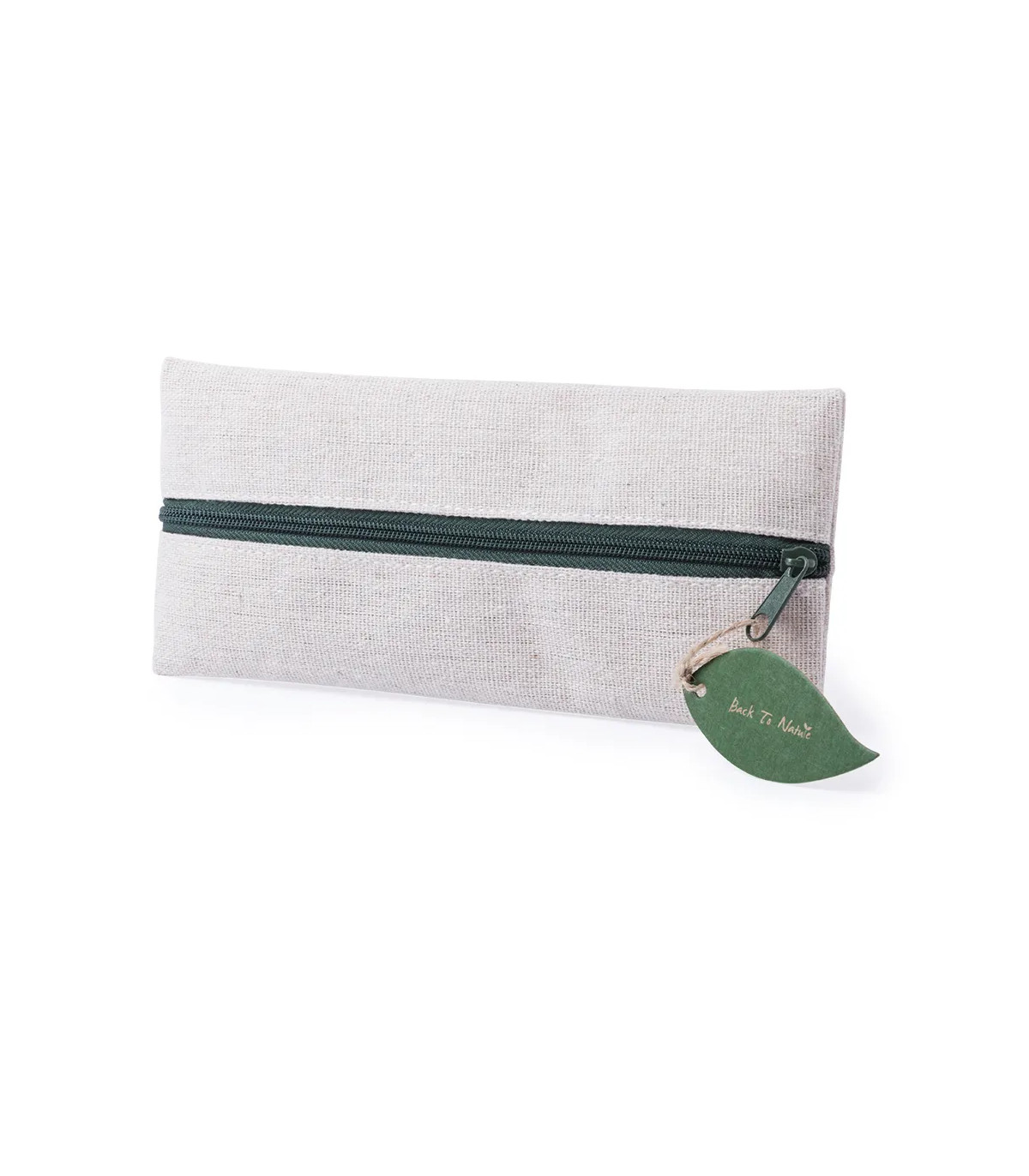 Práctico estuche de línea nature. De tamaño compacto en combinación de materiales yute y algodón. Con cierre de cremallera y hojita para publicidad en tirador.