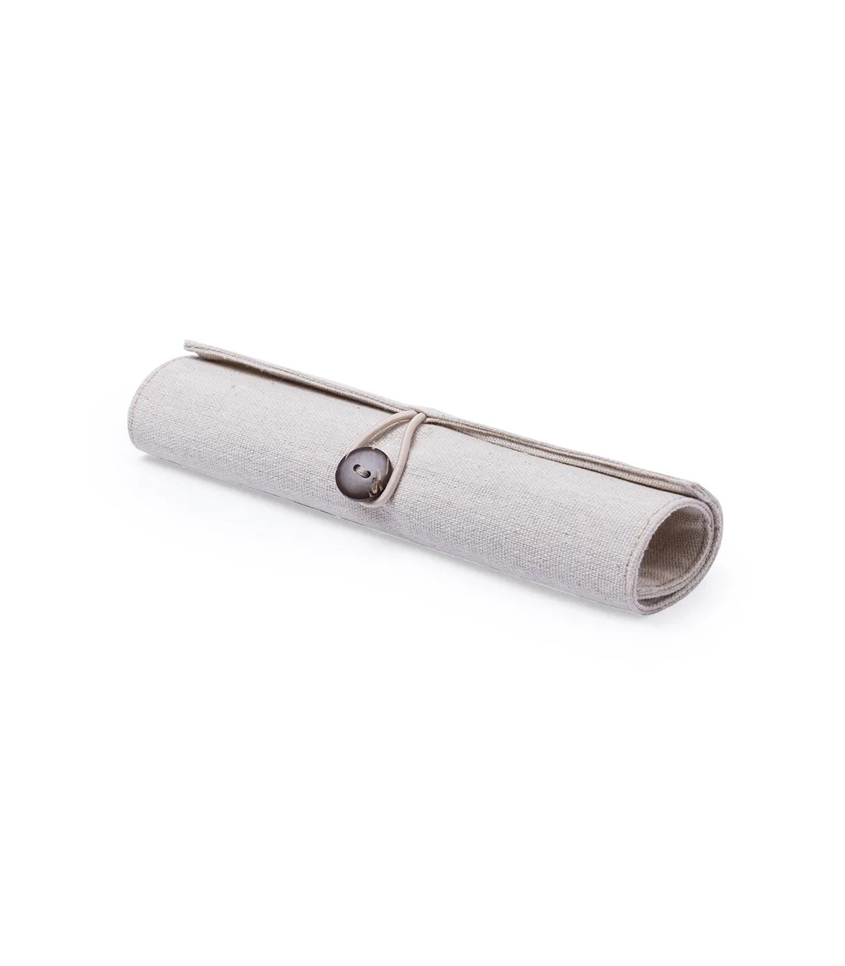 Original estuche de línea nature. Fabricado en yute y algodón, con elegante cierre de botón. Contiene 5 piezas de acabado nature: Goma de borrar, sacapuntas y bolígrafo de cartón reciclado, con lápiz y regla de madera.
