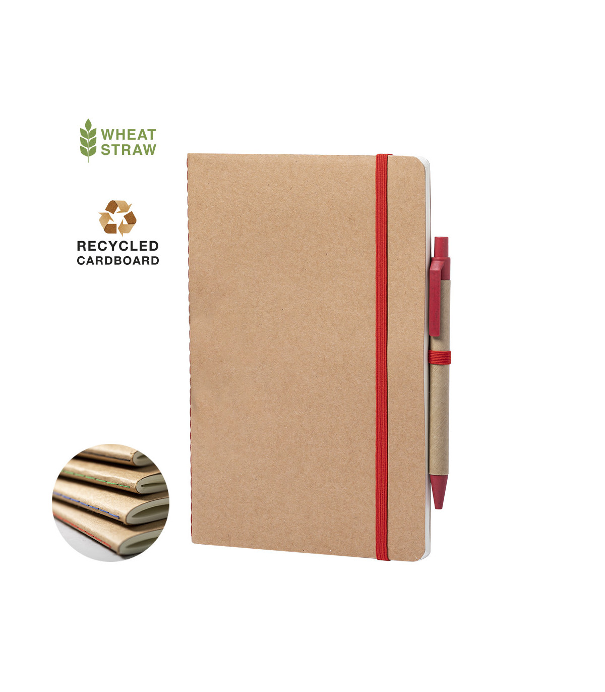 Set de libreta y bolígrafo de línea nature. Incluye libreta en cartón reciclado, con soporte para bolígrafo y cinta de cierre a juego, de 60 hojas lisas. Bolígrafo de mecanismo pulsador, con cuerpo en cartón reciclado y accesorios en caña de trigo -tinta