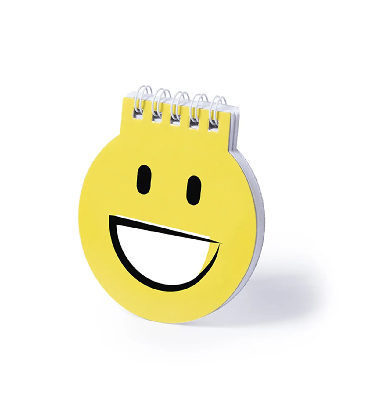 Libreta de divertidos diseños emoji en llamativo color amarillo. De anillas blancas, con tapas de cartón rígidas de suave acabado brillante y 40 hojas lisas.