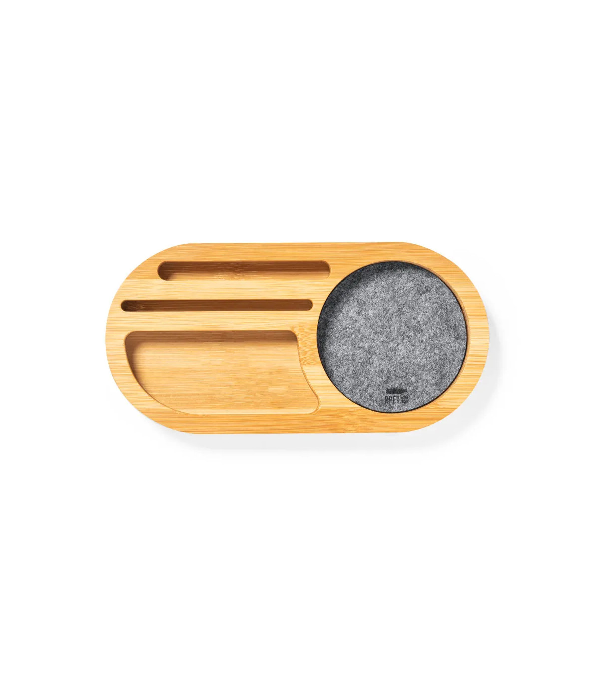 Organizador de línea nature fabricado en bambú en combinación con fieltro RPET. Con función soporte para smartphone, varios compartimentos extra para objetos y amplia superficie de marcaje. Con distintivo fieltro RPET y presentado en caja individual de diseño kraft. El fieltro RPET reciclado es fruto de la combinación del proceso de reciclaje de materiales plásticos junto con la técnica milenaria de fabricación del fieltro, dando como resultado un material de eco-tendencia que, además de ser de origen reciclado, también se convierte en reciclable.