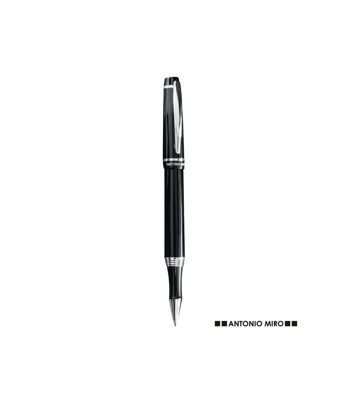 Roller de capucha de Antonio Miró en elegante diseño bicolor y suave cuerpo metálico en sobrio color negro. Con logotipo de la marca bajo la anilla, clip y punta en acabado plateado brillante. Presentado en estuche individual en color negro con logotipo de la marca. En tinta azul.