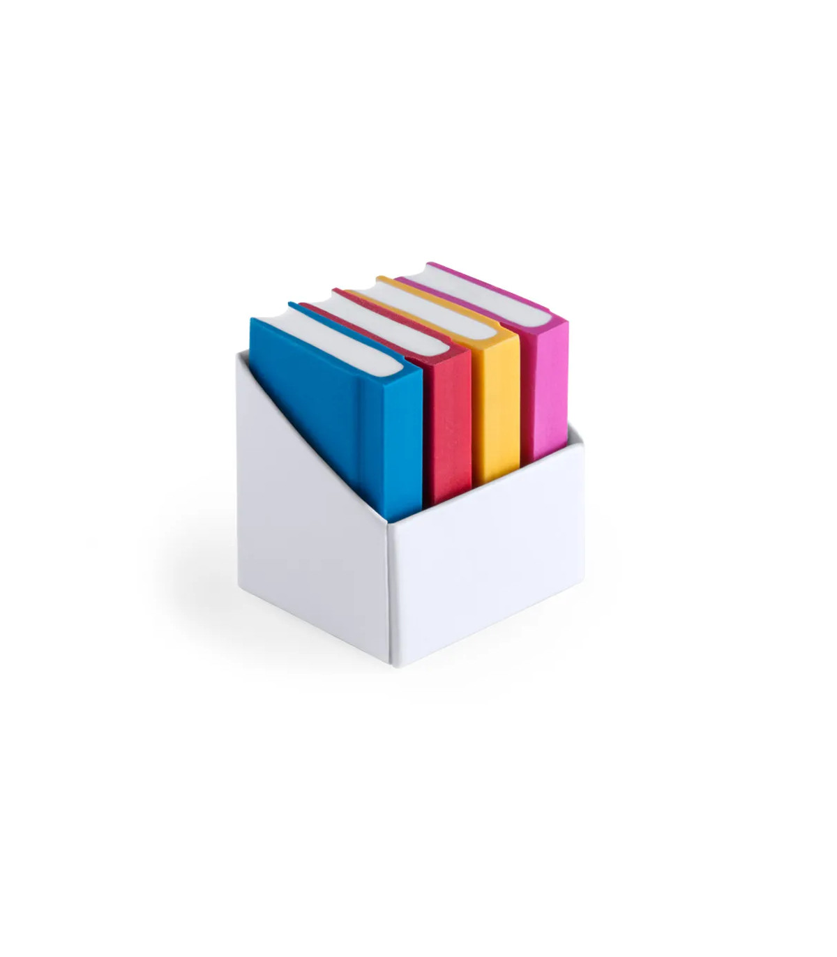 Divertido set de 4 gomas en forma de libro de alegres colores. Presentadas en cajita expositora de cartón blanco.