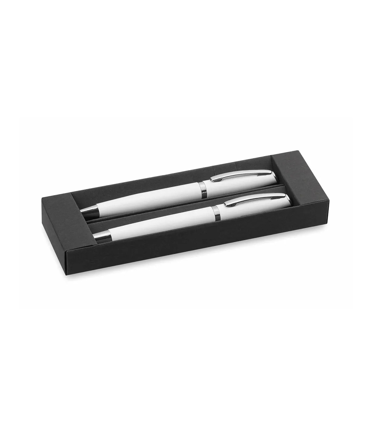Elegante set de bolígrafo de mecanismo giratorio y roller de capucha en sobrio diseño. De cuerpo de aluminio en suave acabado con accesorios en colores plateados. Presentado en estuche individual de cartón con funda en color negro. Bolígrafo con cartucho jumbo. En tinta azul.