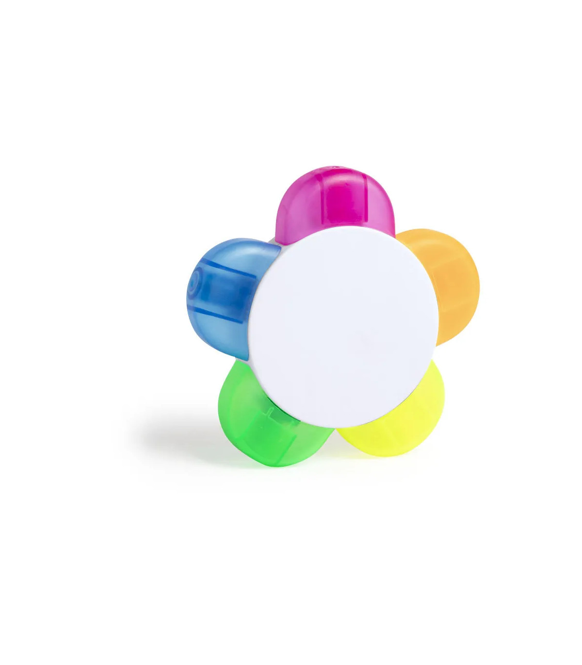 Set de marcadores en original diseño flor. Con amplia superficie de marcaje y subrayadores en colores naranja, azul, verde, amarillo y fucsia.