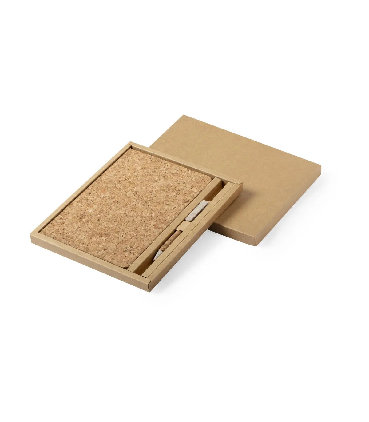 Set de bloc de notas y bolígrafo en línea nature. Incluye bloc de notas con tapas rígidas en corcho natural, con 80 hojas lisas. Bolígrafo de mecanismo pulsador, con cuerpo en corcho natural y accesorios en caña de trigo, para así fomentar la utilización de materias primas naturales y reducir las emisiones contaminantes. Presentado en estuche de cartón troquelado y diseño eco. Tinta negra.