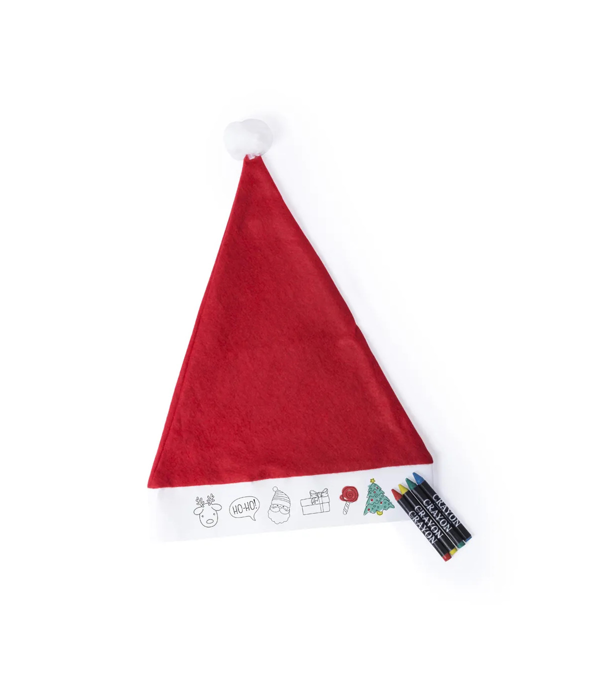 Gorro de Papá Noel para niño. Tira frontal de non-woven en color blanco con divertidos dibujos y especialmente diseñada para colorear con ceras. Incluye 5 ceras de cuerpo cilíndrico en variados colores.