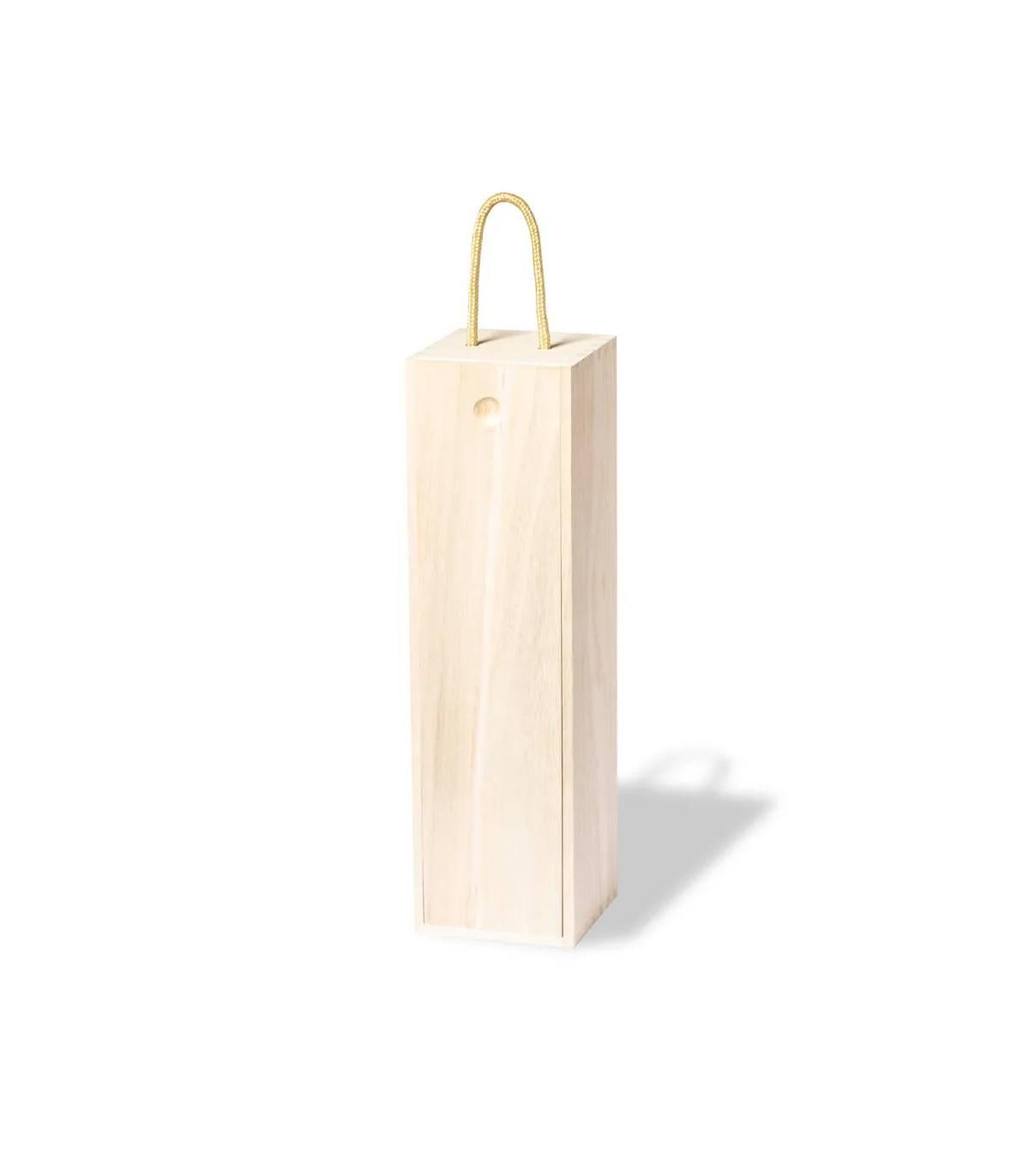 Caja de presentación premium para 1 botella, fabricada en madera natural de Paulownia, ligera y resistente. Interior con sujeción de seguridad para el cuello de la botella, con tapa deslizante y cordón de transporte.