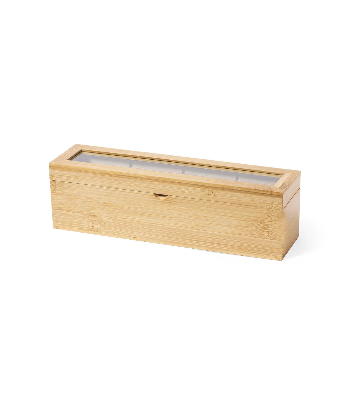 Caja para té de línea nature, fabricada en bambú, con cristal en tapa. Incluye 4 compartimentos para almacenar distintos tipos de té. Presentada en atractiva caja de diseño eco.