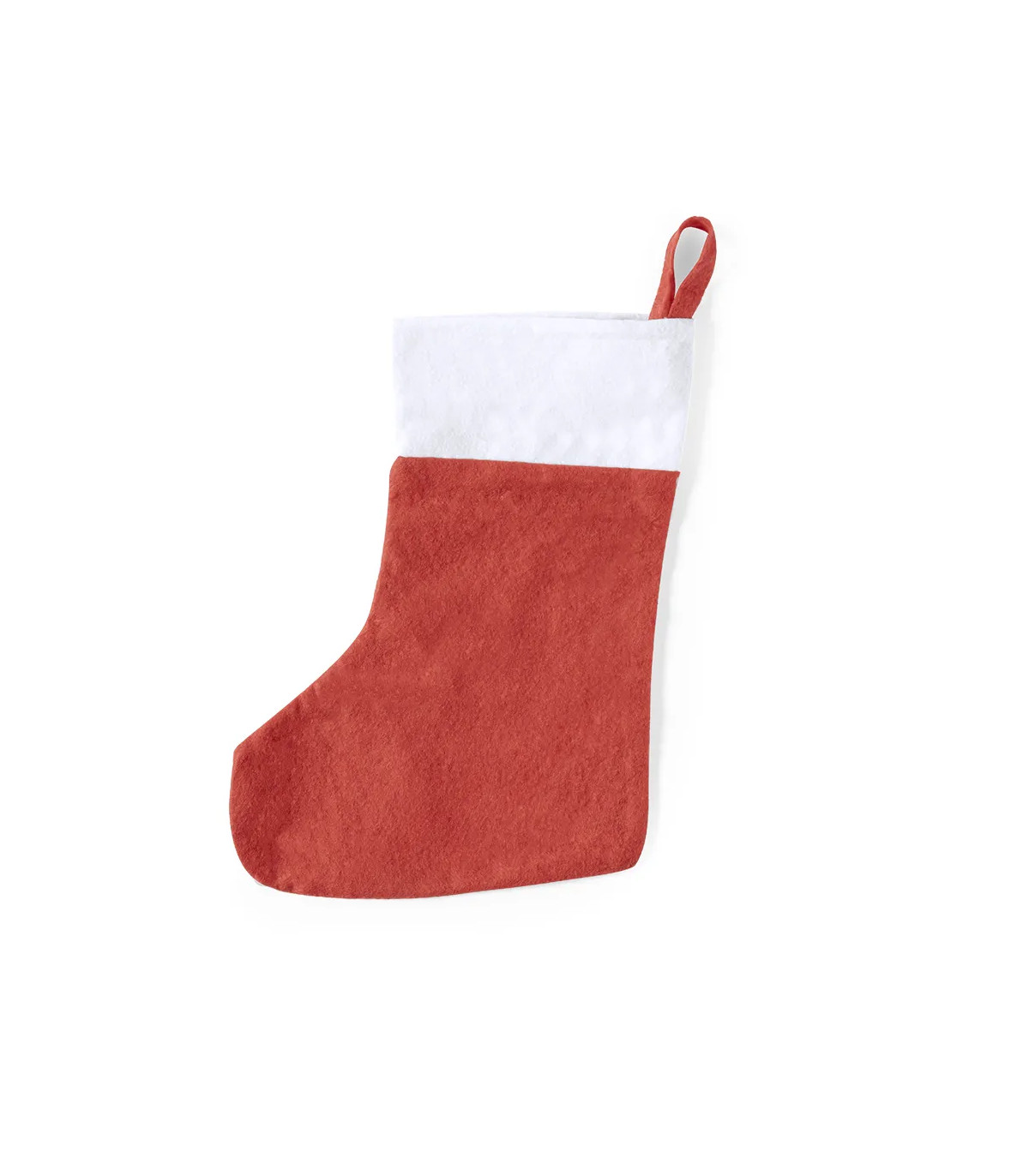 Calcetín navideño de gran capacidad en tradicional combinación de colores navideños y con cinta para colgar.
