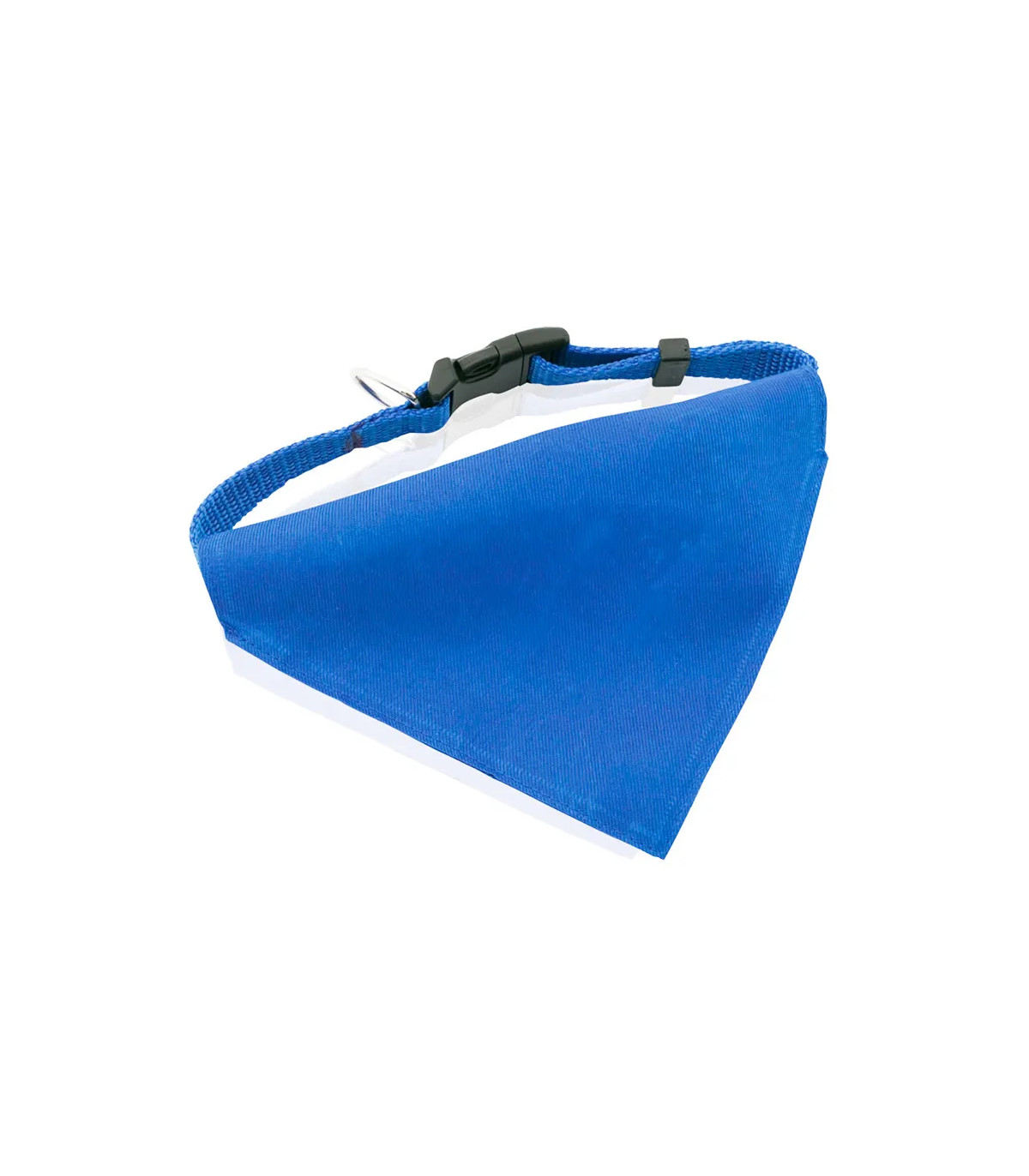 Collar bandana para mascota en resistente y suave poliéster de vivos colores. Con cinta ajustable de cierre de clic y accesorio metálico para cinta de paseo.