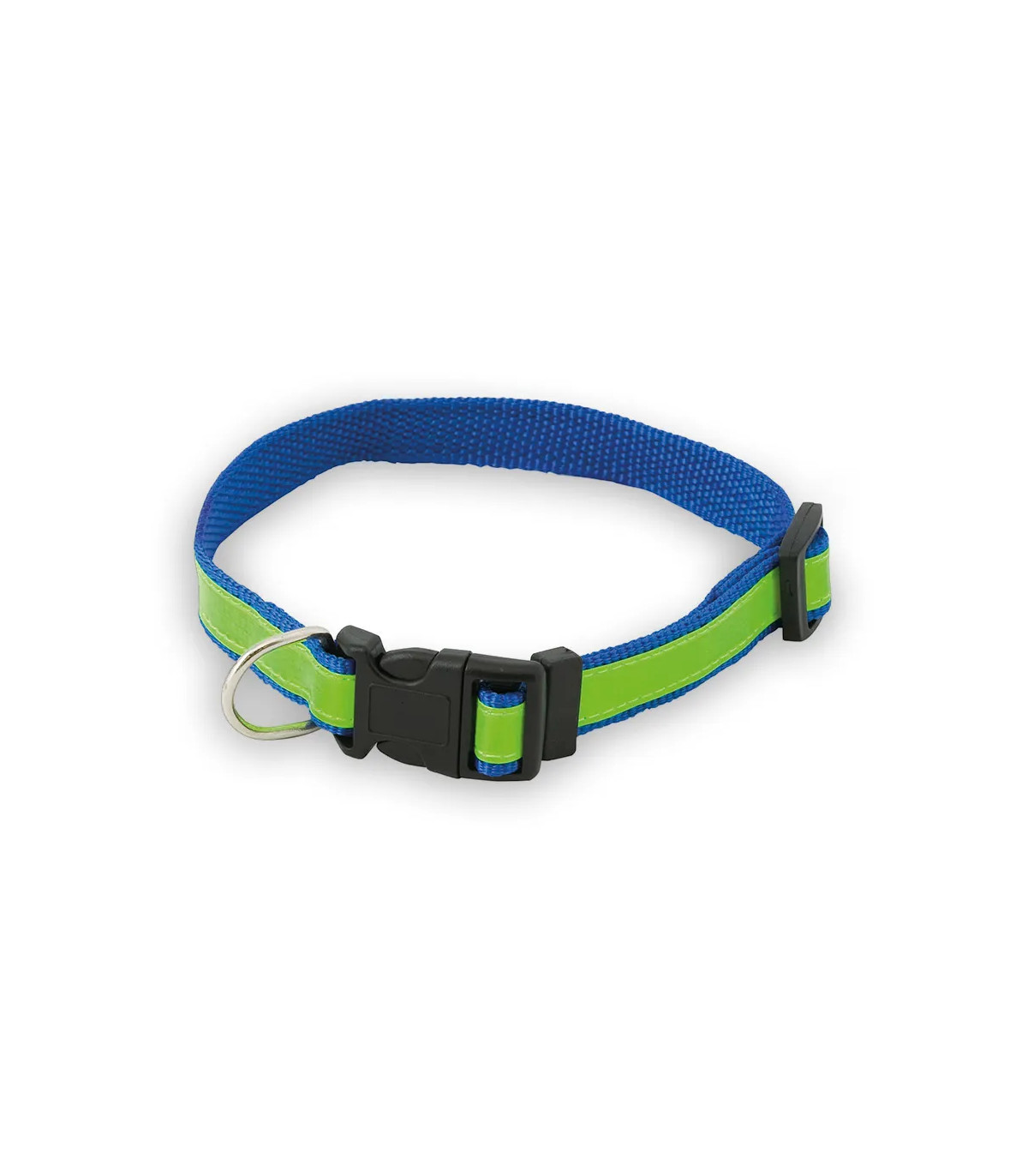 Collar reflectante para mascota en resistente y suave poliéster de vivos colores. Con cinta ajustable de cierre de clic y accesorio metálico para cinta de paseo.