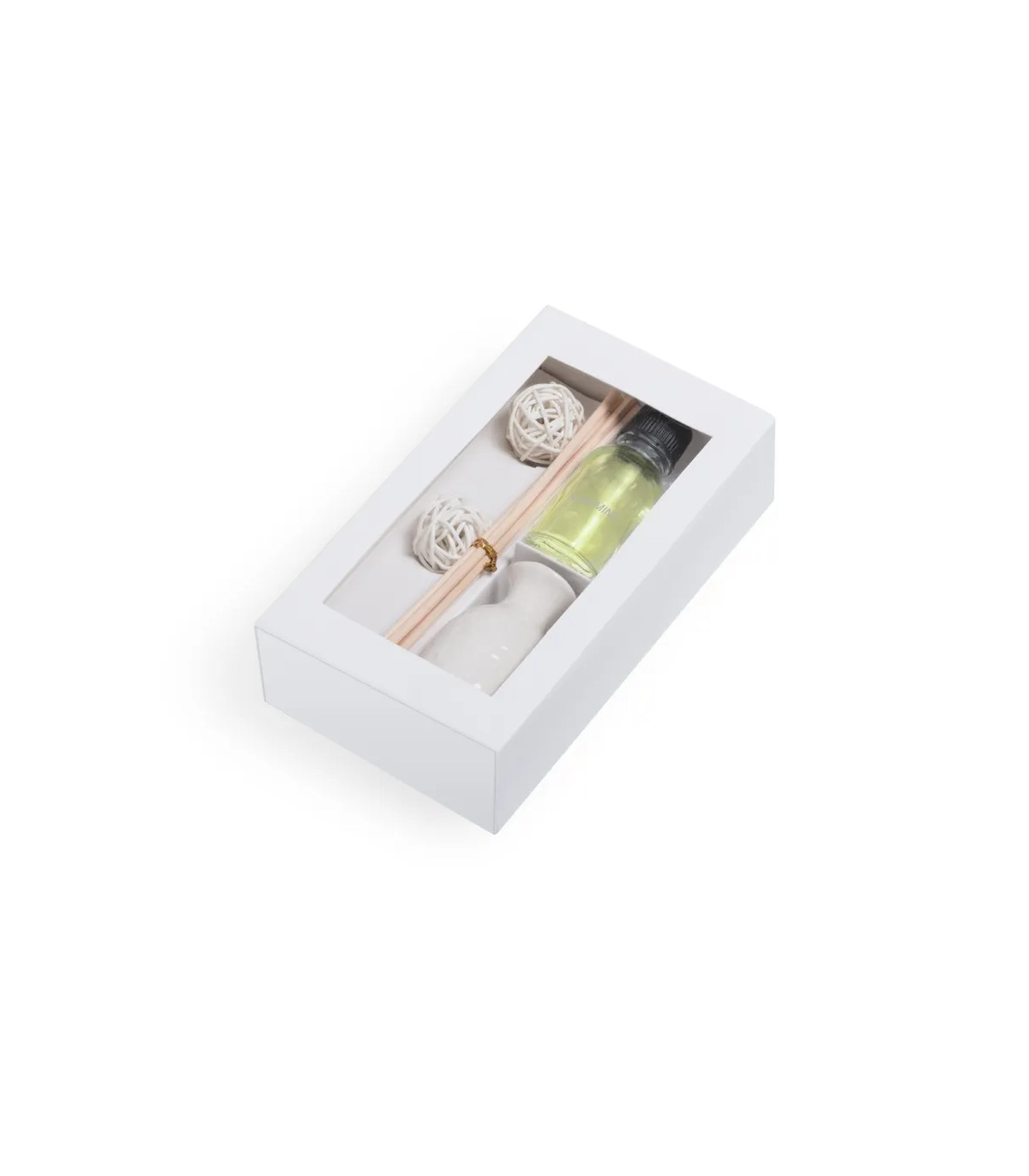 Difusor aromático de agradable aroma jazmín. Incluye tarro de fragancia en cerámica, palitos aromáticos y tarro de cristal de 15ml con fragancia. Presentado en estuche individual con compartimentos independientes y ventana.