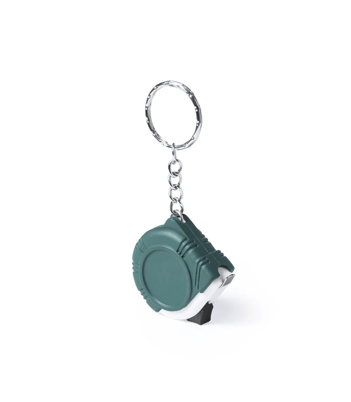 Flexómetro llavero de 1 metro con cuchilla metálica y mecanismo de bloqueo. Medidas en centímetros, pulgadas y pies. Con troquelado especial para marcaje.