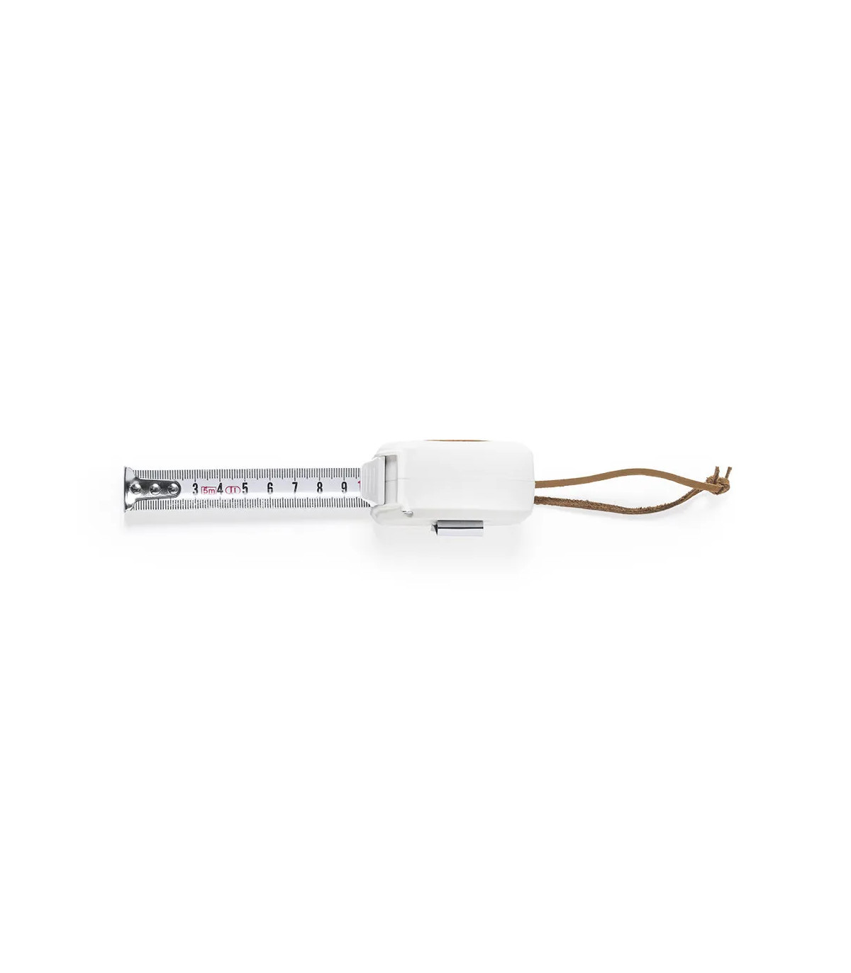 Flexómetro de 5 metros de línea nature, fabricado en combinación de bambú y ABS con tacto goma. Hoja metálica con freno, clip metálico para cinturón y cinta de transporte en PU. Con amplia superficie de marcaje y presentado en atractiva caja de diseño eco
