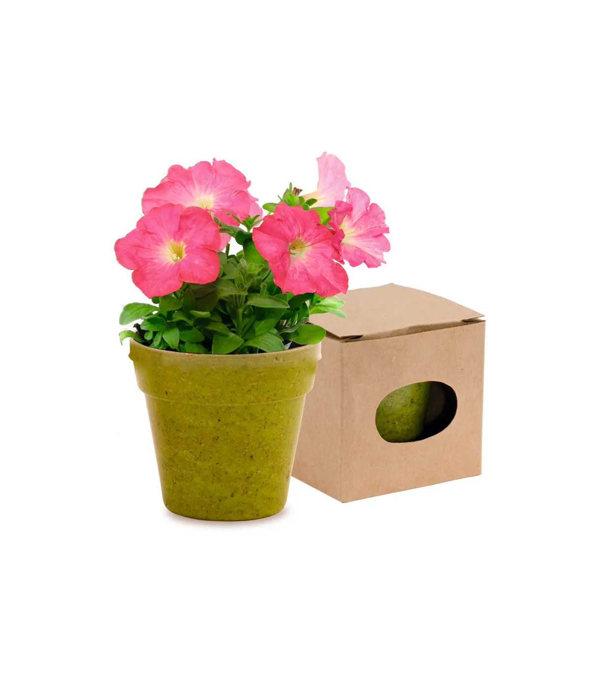 Macetas con semillas de Petunia en macetero de línea nature y en variados colores. Con 5-8 semillas y bolsita de sustrato de crecimiento.