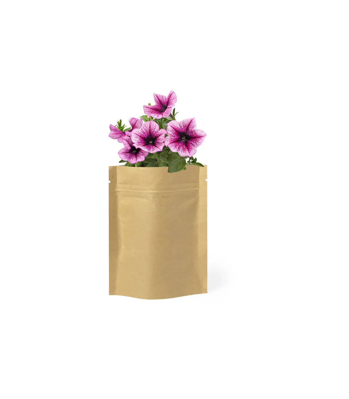 Maceta de línea nature en sobre de papel. Con 5-8 semillas de petunia y bolsita con sustrato de crecimiento.