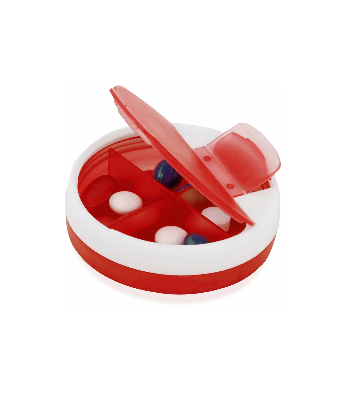 Original pastillero en diseño bicolor con tapa dispensadora de pastillas y 4 compartimentos interiores.