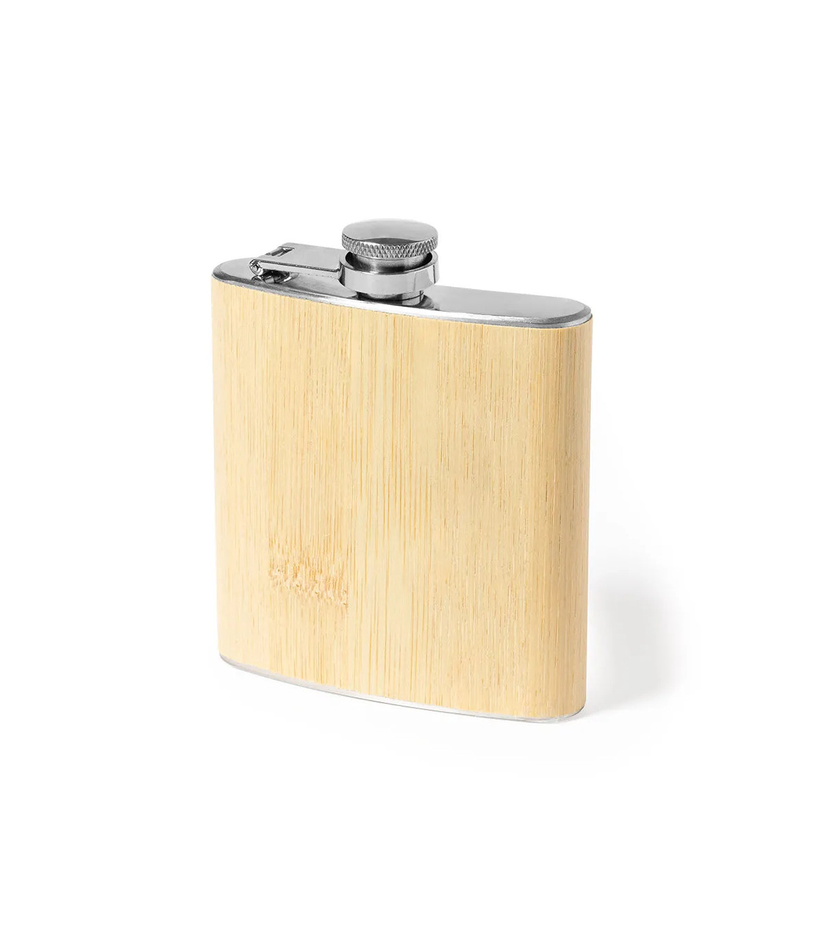 Petaca de línea nature y 200 ml de capacidad. Exterior en bambú de suave acabado, con cuerpo de acero inox y tapón de seguridad a rosca. De diseño ergonómico para guardar cómodamente en el bolsillo. Presentada en caja individual de diseño eco en cartón kr