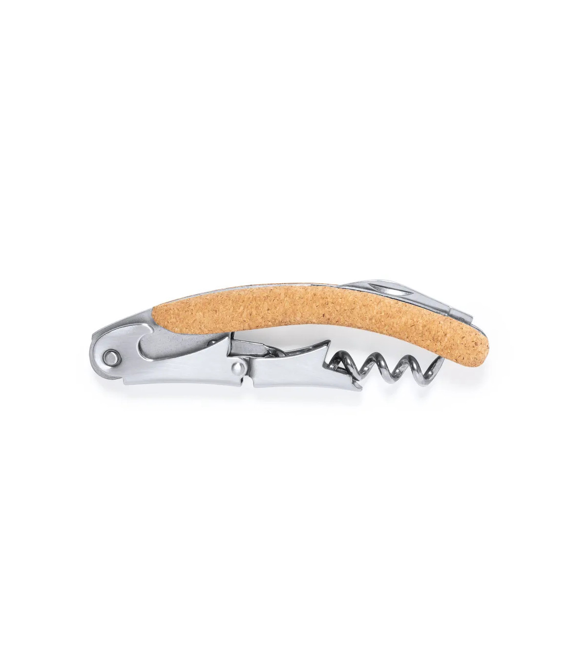 Sacacorchos de 2 tiempos fabricado en acero inox, con mango en corcho natural y cortacápsulas integrado. Presentado en caja individual de diseño kraft.