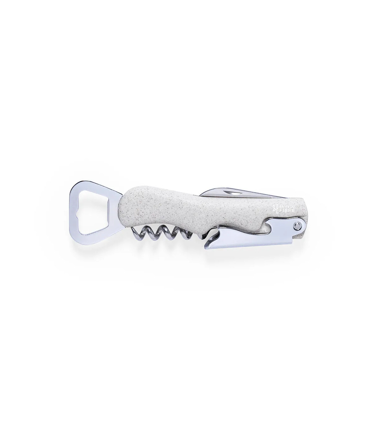 Sacacorchos de línea nature con abridor de botellas y cortacápsulas. Fabricado en fibra de bambú y ABS, con accesorios en acero inox. Presentado en atractiva caja individual de diseño eco.