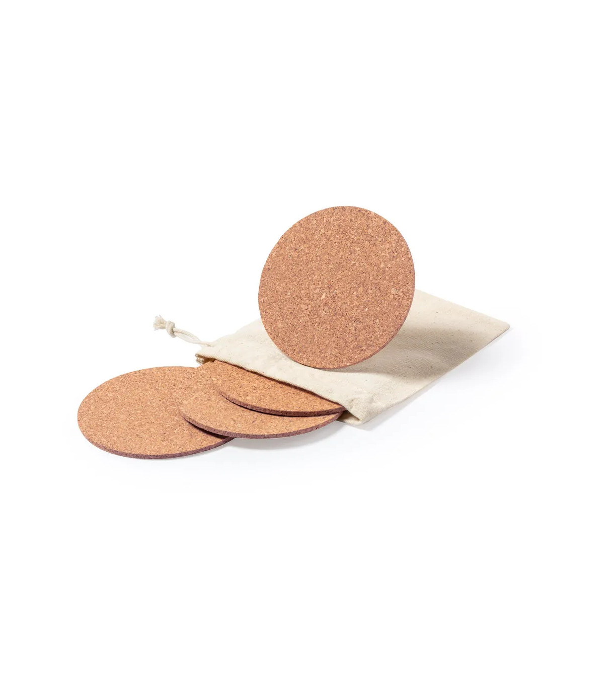 Set de 4 posavasos de línea nature, fabricados en corcho natural. Presentación en bolsa de algodón 100% con cierre de cordón.