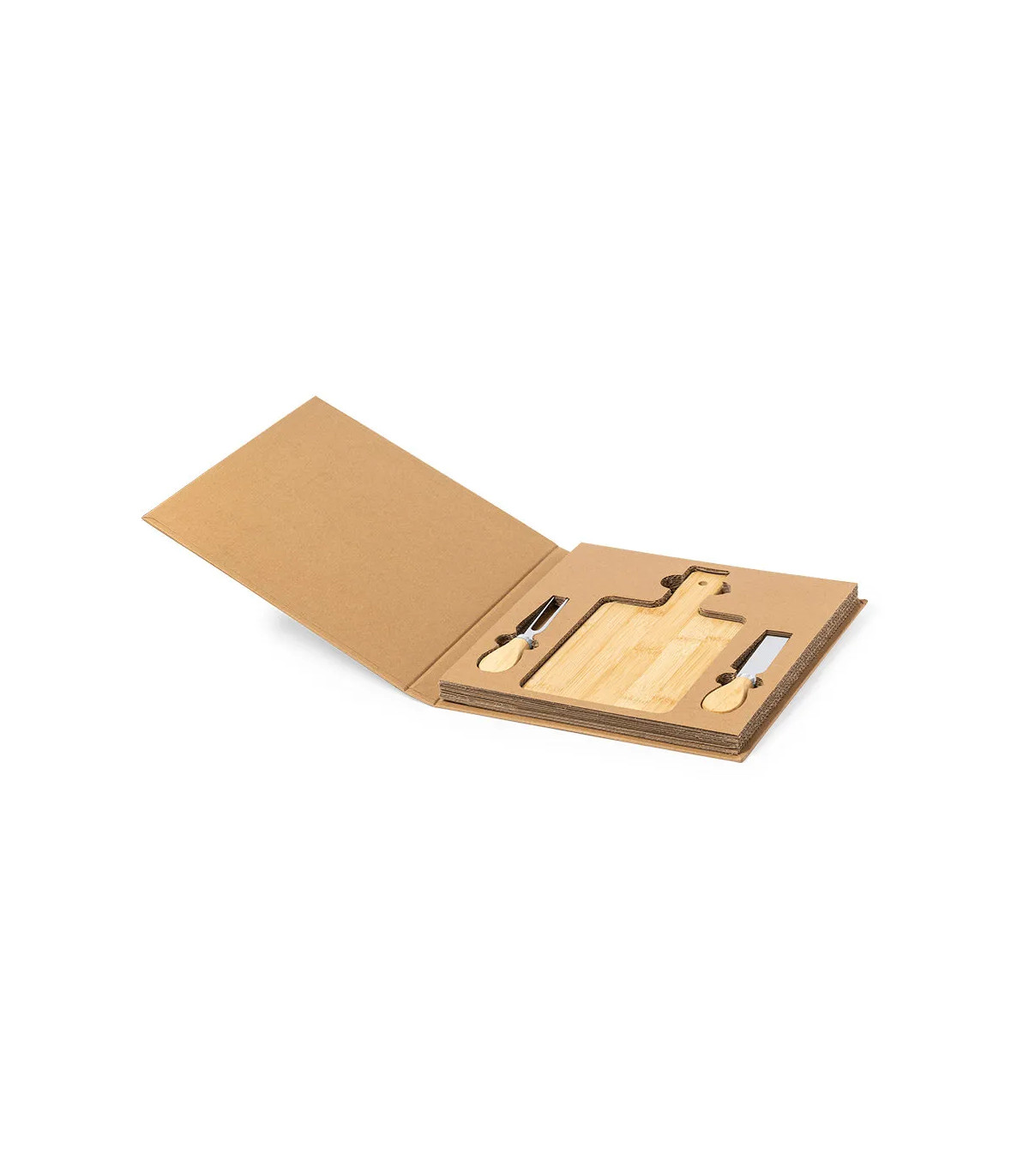 Completo set de quesos de línea nature, fabricado en bambú y acero inoxidable. Incluye tabla de corte y presentación con mango y agujero para colgar, trinchador y cuchillo. Presentado en estuche individual troquelado de cartón reciclado acabado kraft.