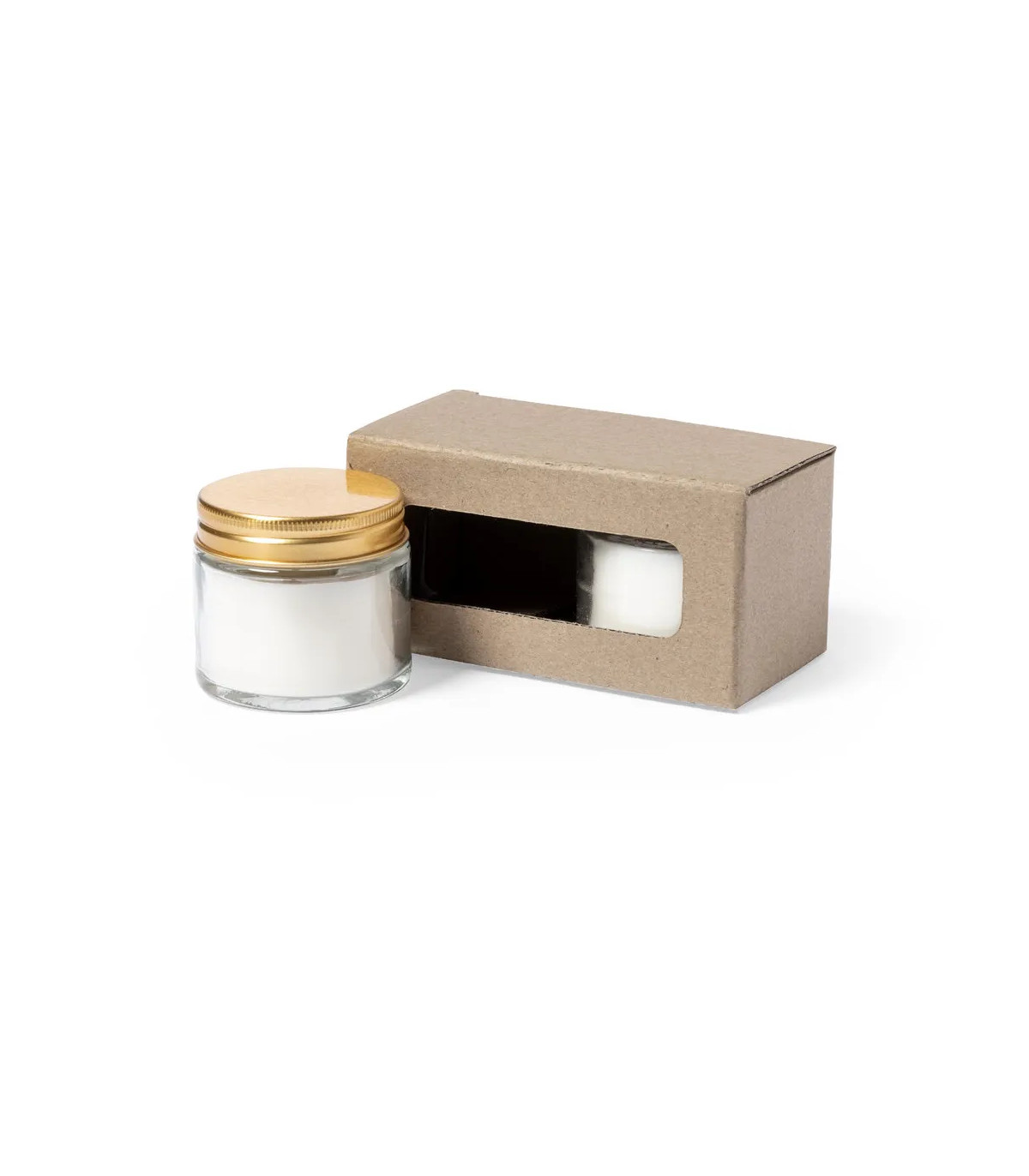 Set de velas aromáticas, con cera vegetal y aroma de flor Fresia. En tarrito de cristal con tapón a rosca metálico y acabado dorado. Presentadas en caja individual kraft.