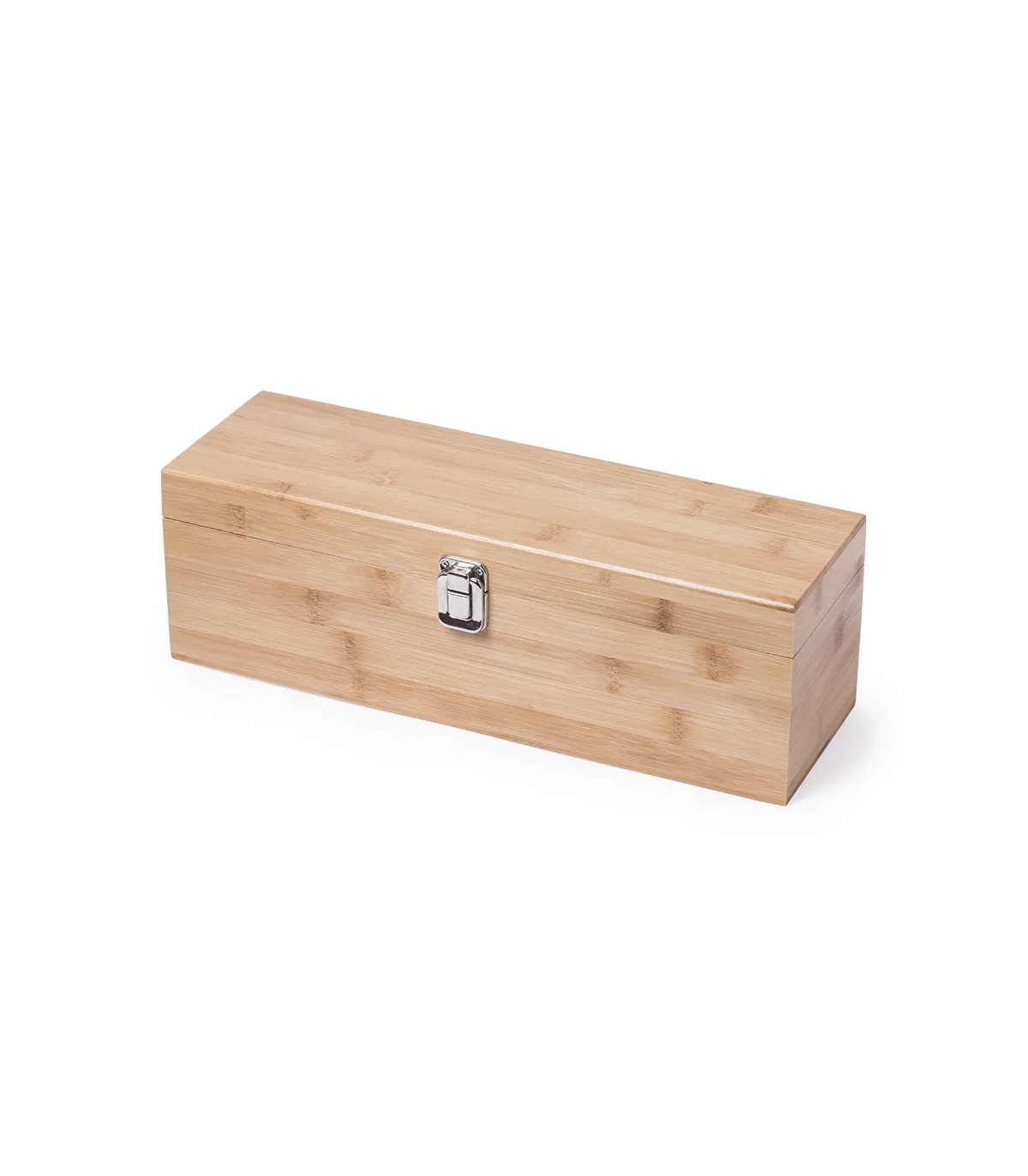 Set de vinos premium acabado en madera bambú. Accesorios de acero inox. Incluye sacacorchos, cortacápsulas, tapón, dosificador y recogegotas. Presentado en estuche individual de madera de bambú, con compartimento interior para botella de vino -no incluida-.