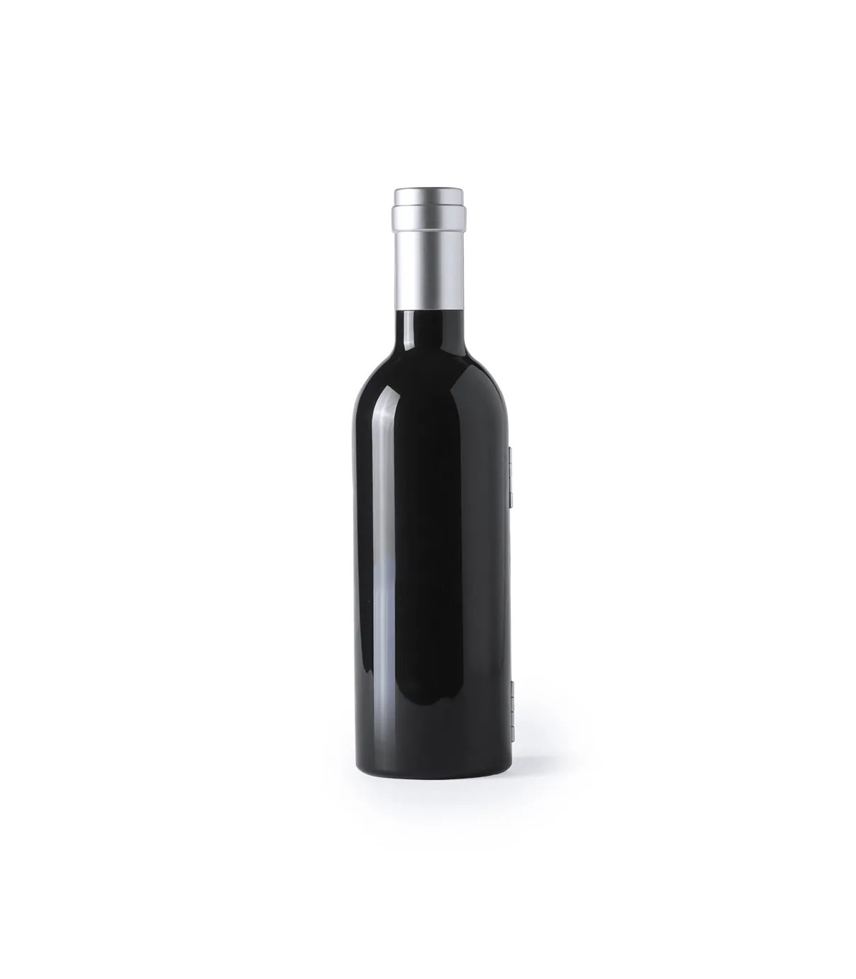 Original set de vinos en forma de botella de vino de acabado brillante, cierre magnético y accesorios de acero inox. Incluye sacacorchos con cortacápsulas y abridor, tapón dosificador, recogegotas, cortacápsulas y tapón. Presentado en estuche individual con interior en suave espuma troquelada.