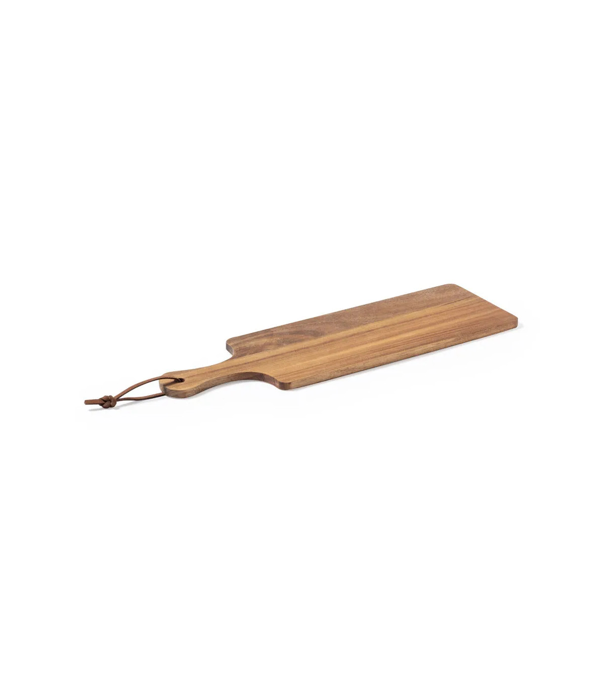 Tabla de corte y presentación fabricada en madera natural. En formato rectangular, con asa y cordón en resistente polipiel a juego.