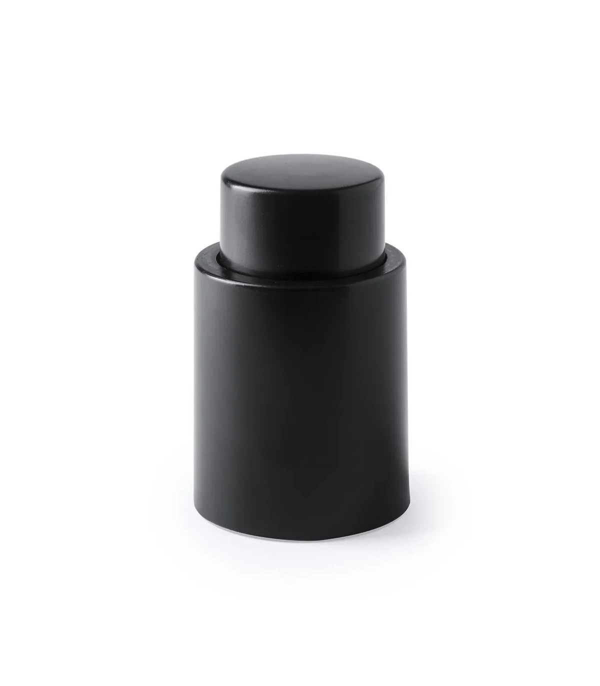 Tapón con bomba de vacío para botellas de vino en elegante diseño de color negro. Parte superior del tapón para marcaje en tampografía. Presentado en caja individual.