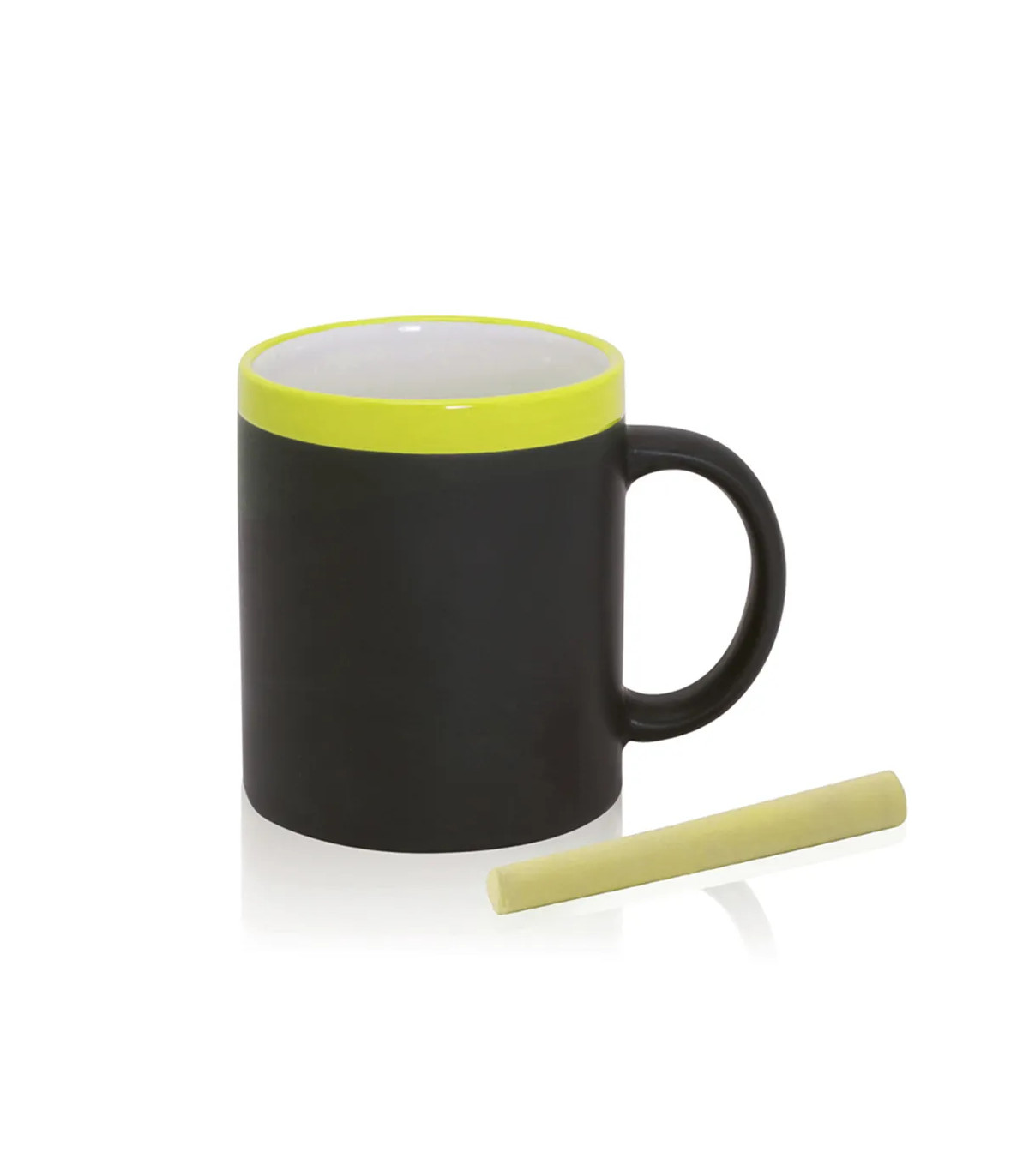 Taza de cerámica de 350ml de capacidad con cuerpo negro pizarra para pintar y boca en divertida gama de vivos colores. Tiza incluida a juego y presentada en caja individual.