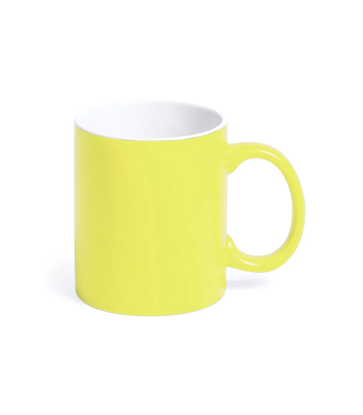 Taza de cerámica de alta calidad de 350ml de capacidad. Parte exterior en vivos colores, especialmente diseñada para marcaje en láser, e interior en color blanco. Al grabar el logotipo en la parte exterior, se muestra el color del interior de la taza. Presentada en caja individual.