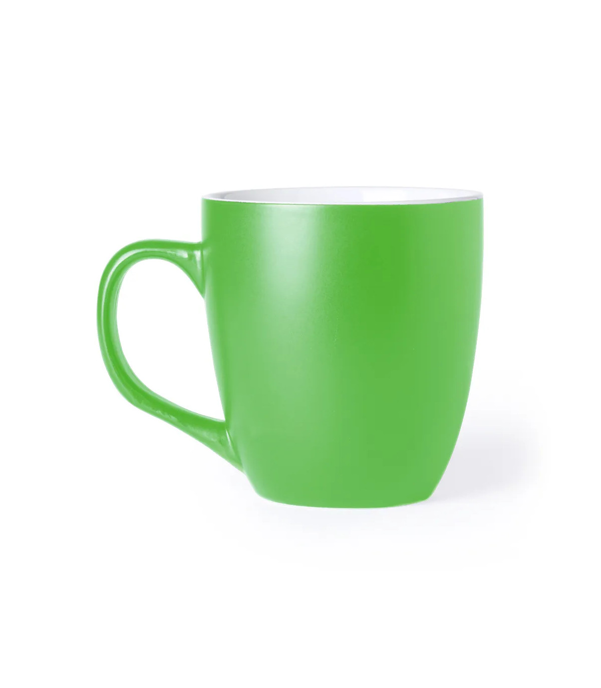 Taza de cerámica de 440ml de capacidad con exterior en variada gama de vivos colores e interior en color blanco. Presentada en caja individual.