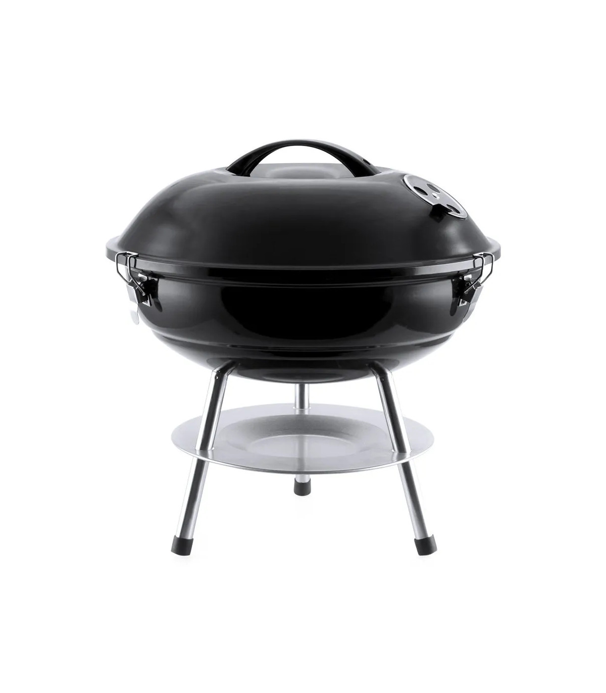 Barbacoa fabricada en resistente acero al carbono de acabado en negro. Tapa con cómoda asa y orificios de ventilación, con parrilla metálica, plato antigoteo y pies antideslizantes. Presentada en atractiva caja de diseño.