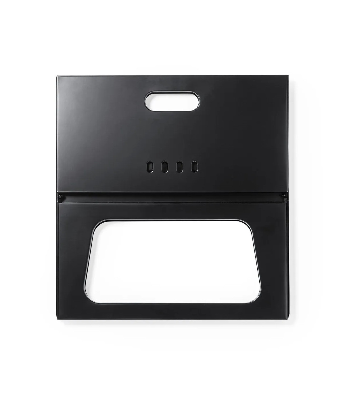 Barbacoa plegable fabricada en resistente metal de acabado en negro. Con cómodas asas y parrilla, de fácil plegado y tamaño compacto. Presentada en atractiva caja individual de diseño.