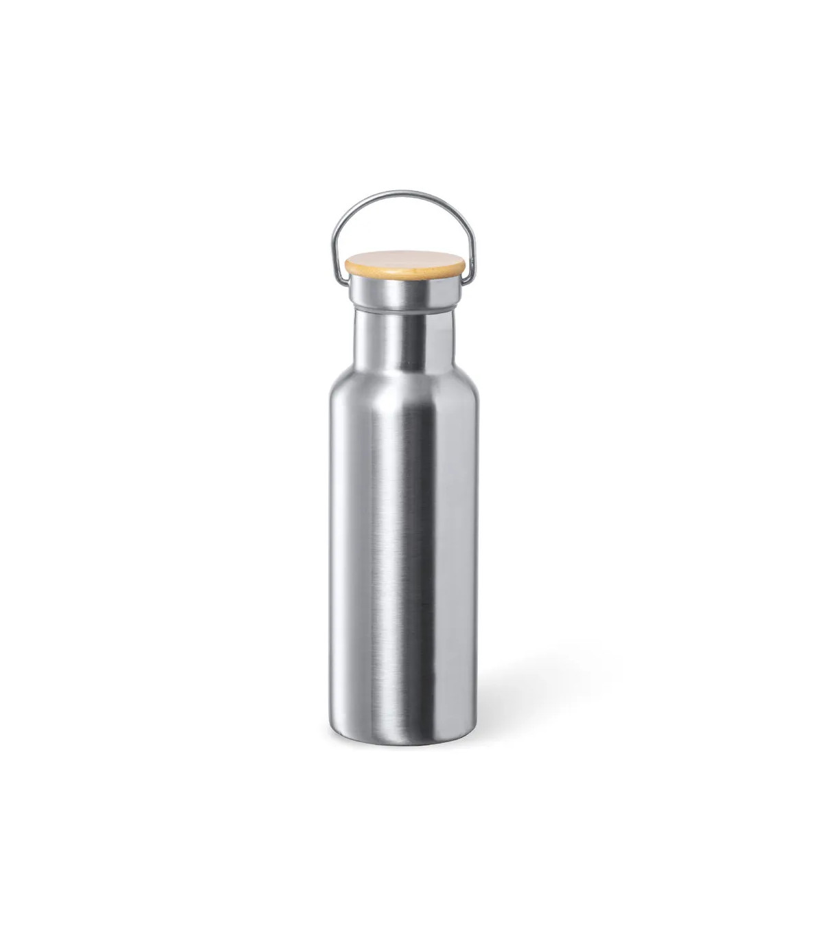 Bidón térmico de 500 ml de capacidad, fabricado en acero inox de doble pared y acabado mate. Incluye original tapón a rosca en acero inox, con detalle de bambú y asa integrada. Libre de BPA y presentado en caja individual de diseño kraft.