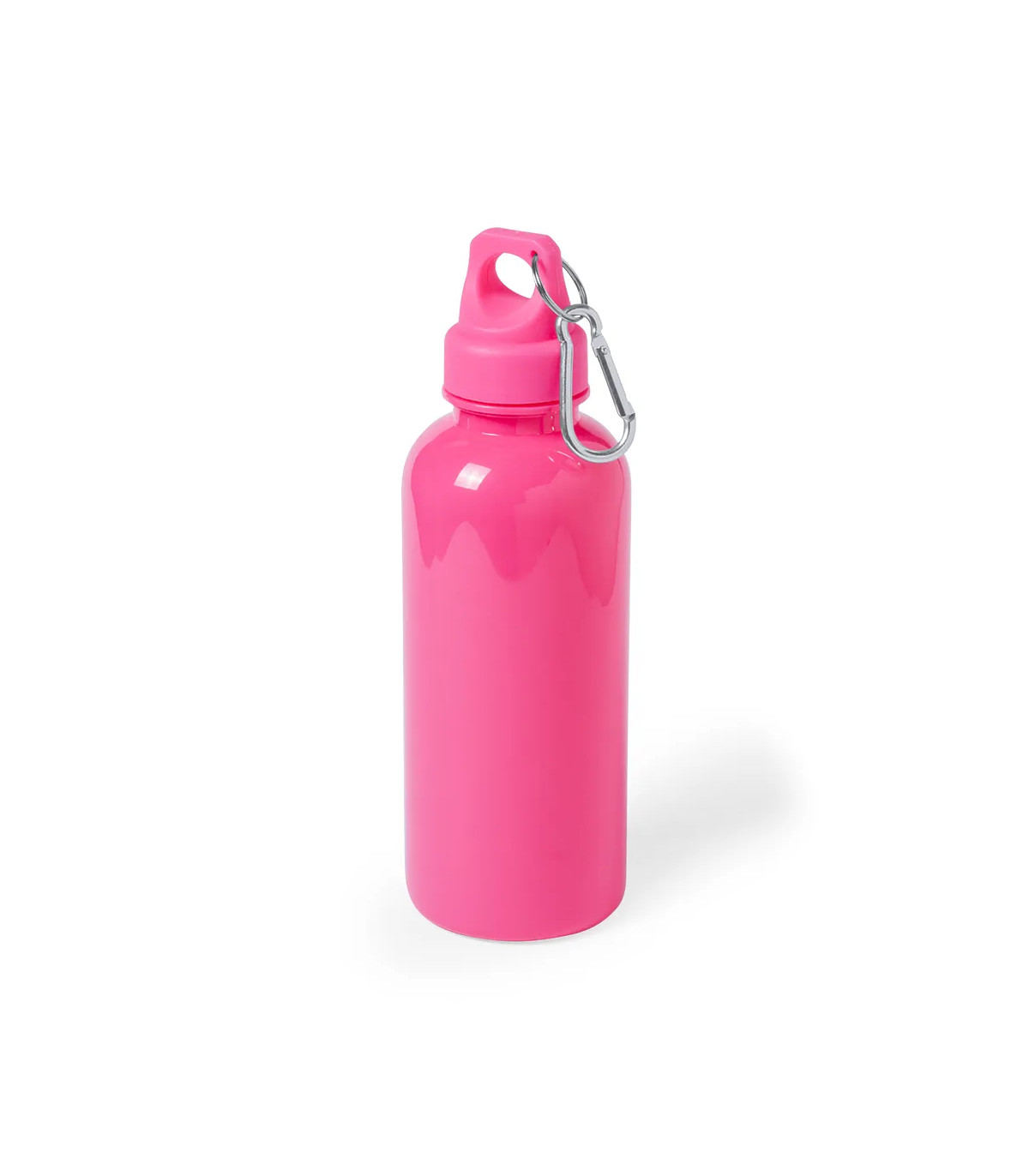 Bidón de 600ml de capacidad con cuerpo de acabado en PS translúcido de vivos y variados colores. Con tapón de seguridad a rosca y mosquetón metálico de transporte.