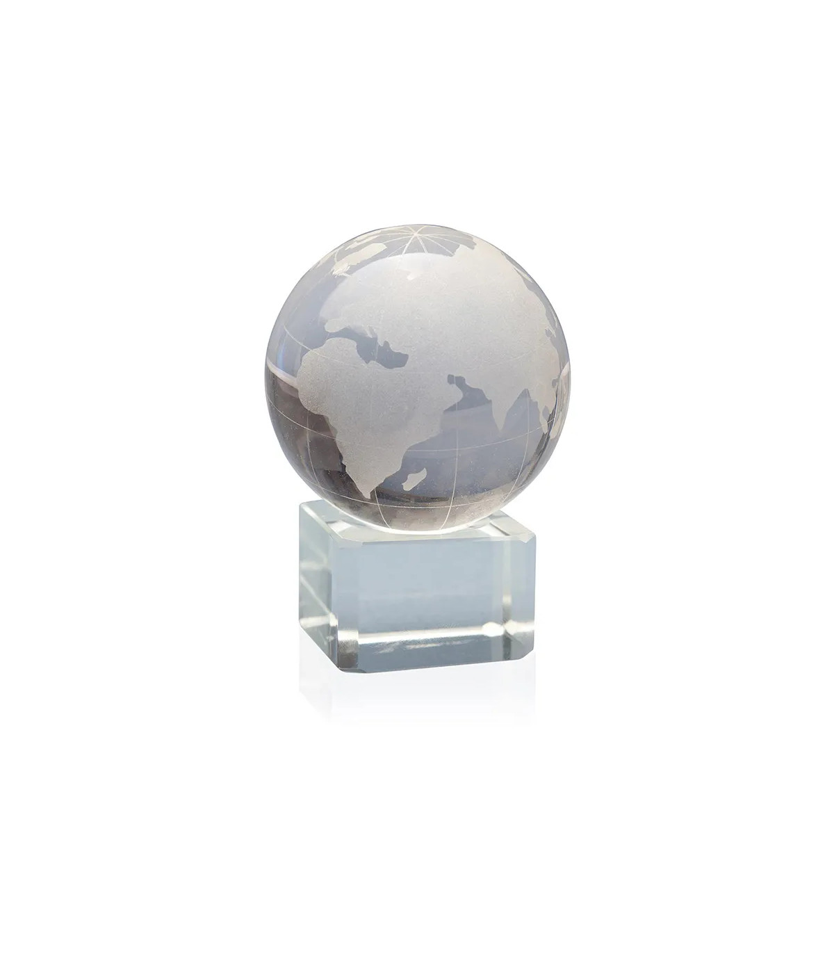 Bola de cristal con forma de planeta Tierra con base para marcaje en láser. Presentada en estuche de protección individual.
