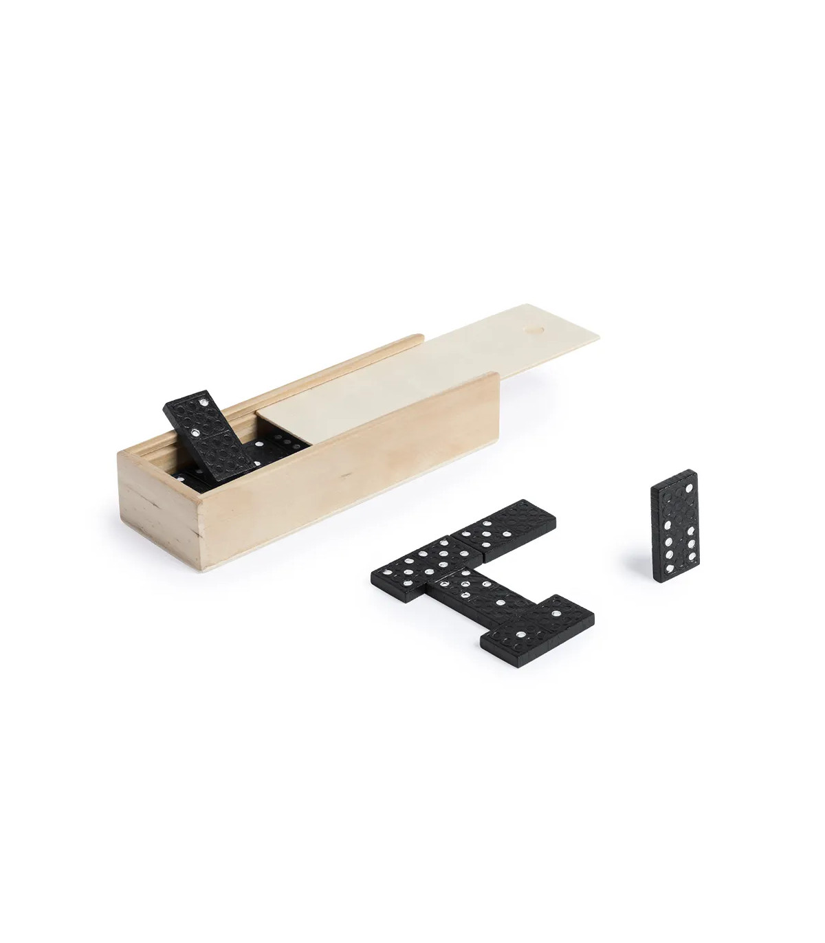 Dominó clásico de 28 piezas fabricado en madera. Piezas en sobrio diseño de color negro con detalle en blanco. Presentado en estuche individual de madera con tapa.