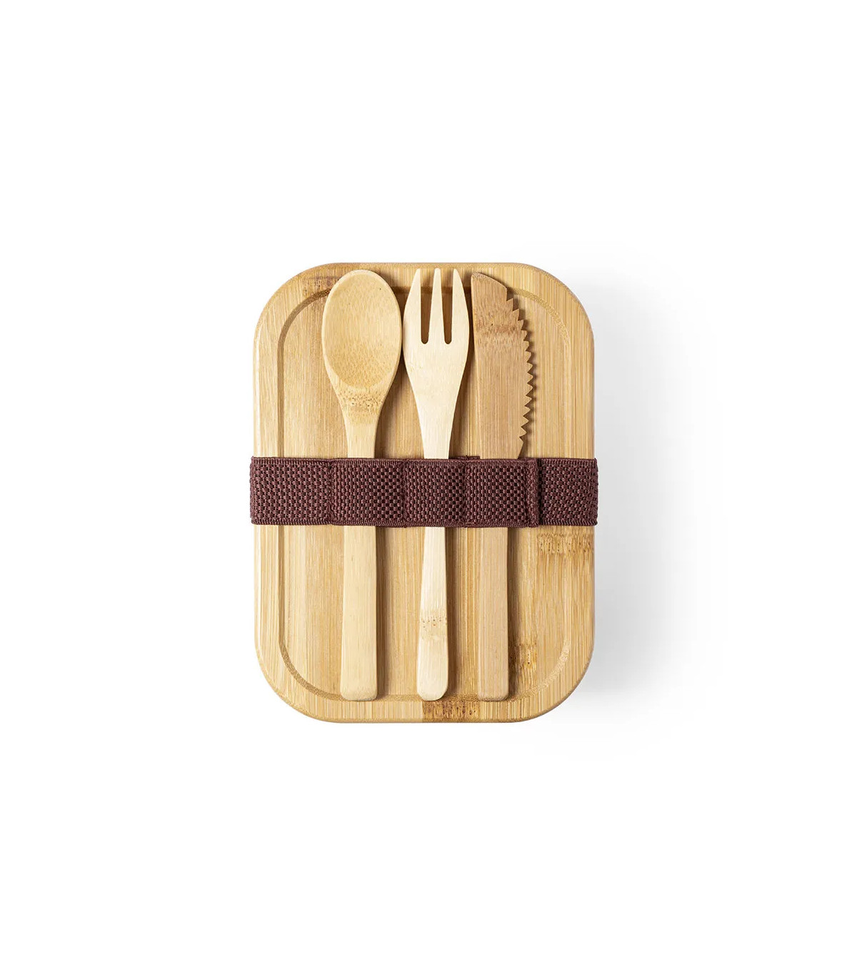 Fiambrera de línea nature de 700 ml de capacidad. Fabricada en cristal, con tapa hermética de bambú pulido, con banda de goma para evitar derrames y rebaje para usarla como bandeja. Incluye cinta de seguridad con tenedor, cuchara y cuchillo. Presentada en